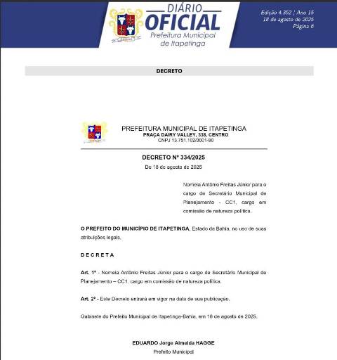 No Diário Oficial da Prefeitura de Itapetinga está o Decreto de Nº 334/25 com o nome do novo gestor da pasta.
